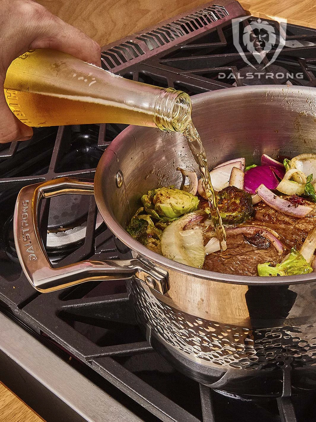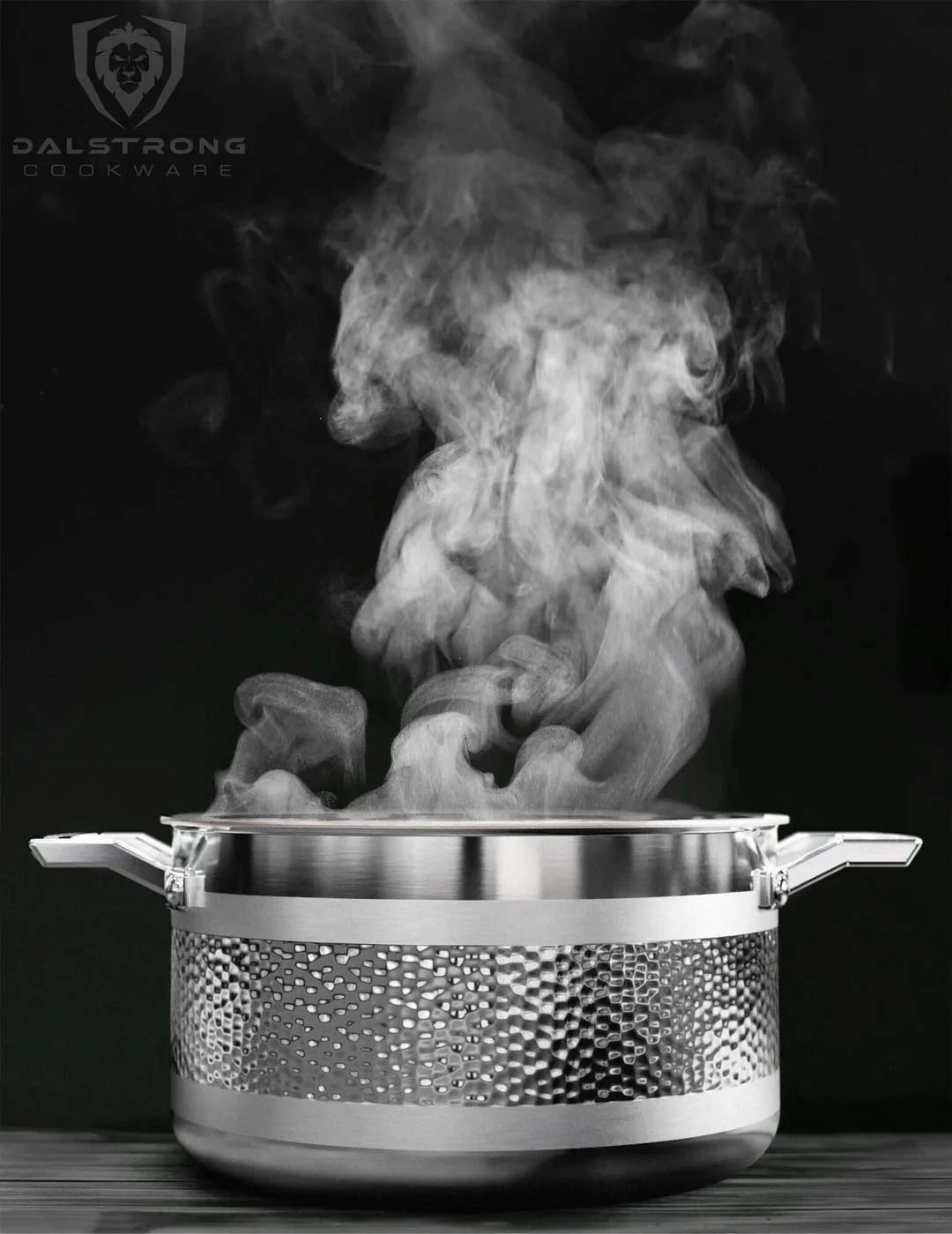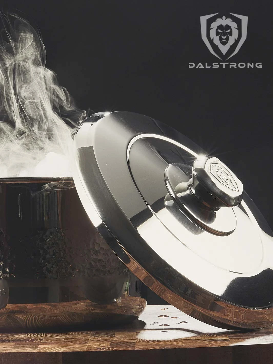 - The lid knob is made from thick, cast steel that proudly displays the Dalstrong lion insignia.