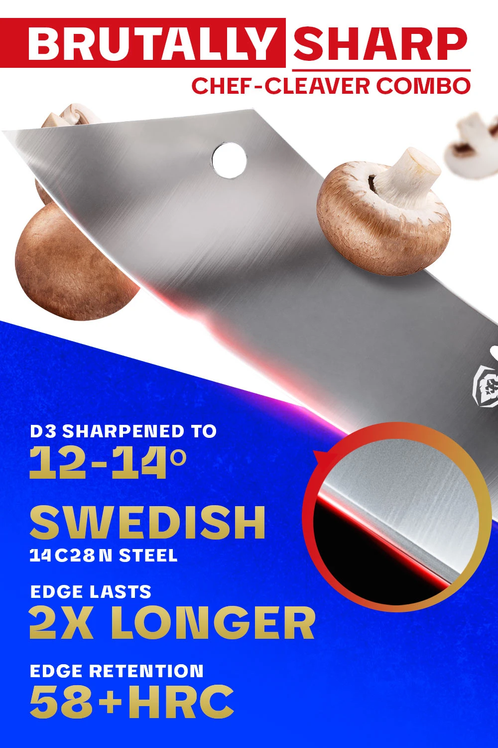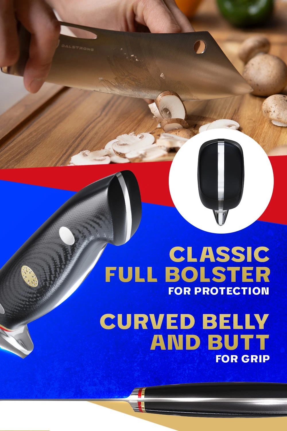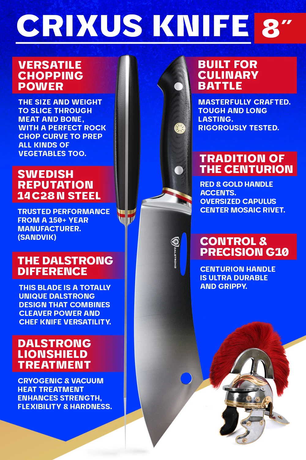The “Crixus” is a specialty blade, unique to Dalstrong, designed for meat lovers and BBQ enthusiasts. Part chef knife, part cleaver, this hybrid is the go-to tool of choice for those who prepare a lot of meat, especially from start to finish. This blade has the size and weight to slice through tough cuts of meat and bone, while still being maneuverable and versatile enough to wield through the rest of your prep work as well.
