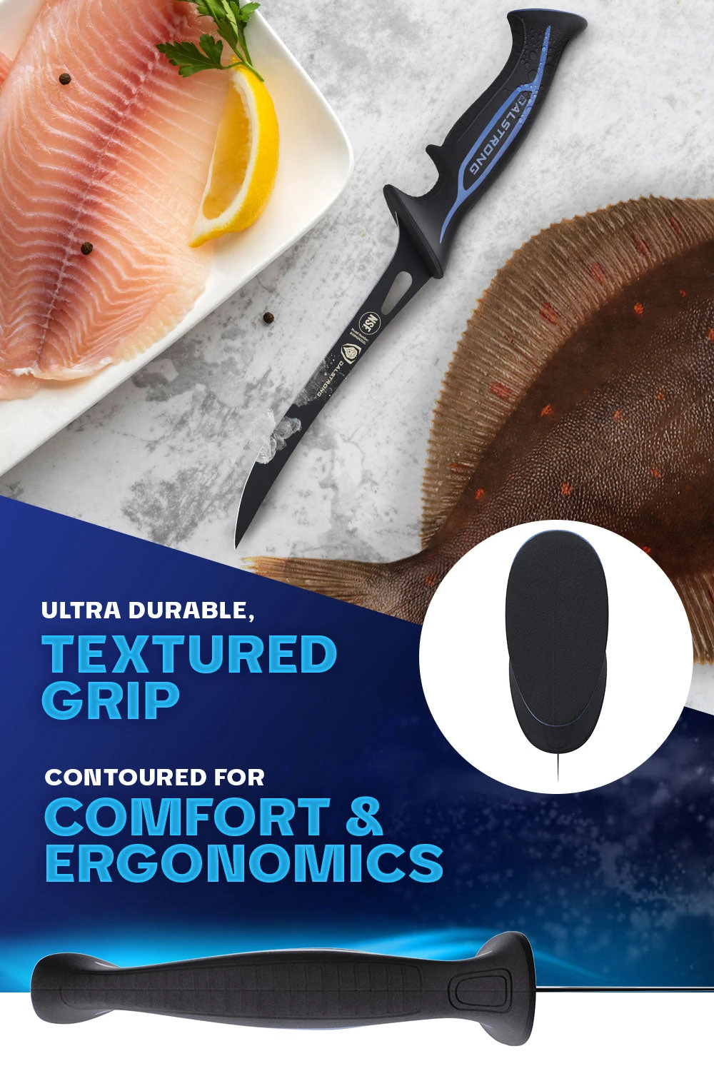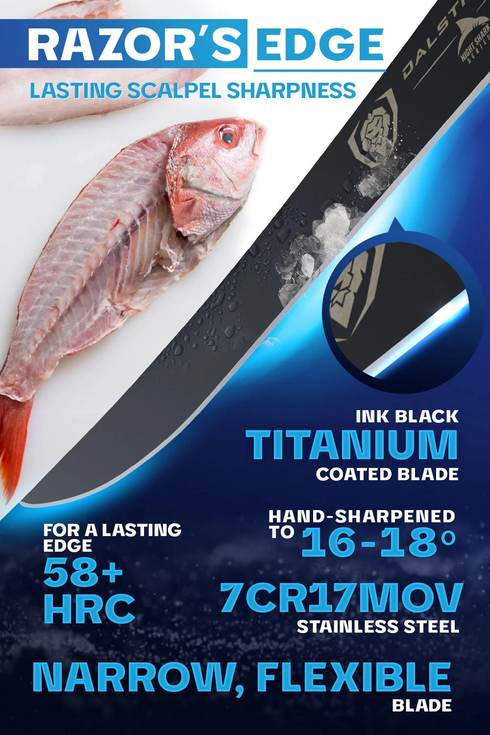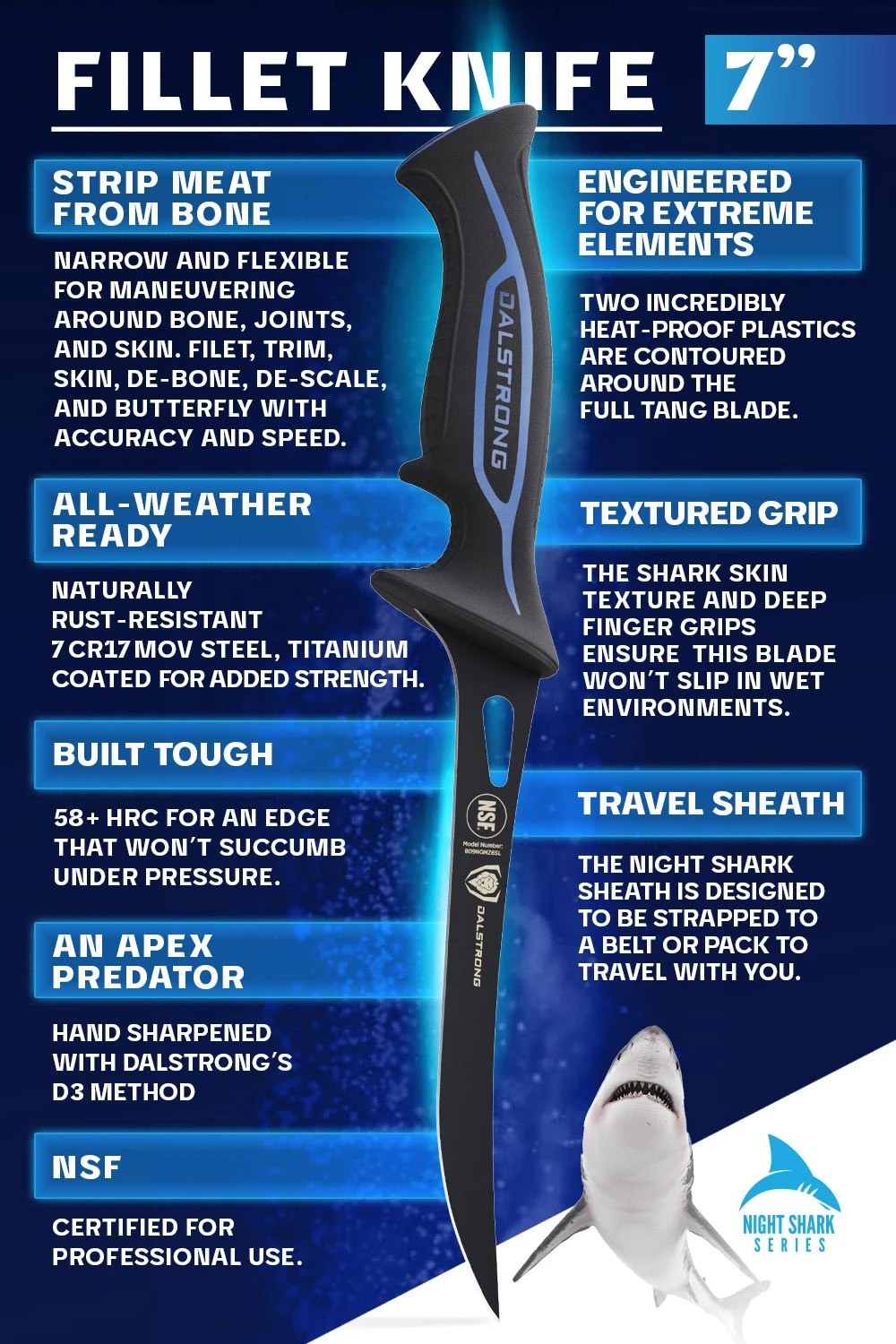 Strip meat from the bone. The Night Shark 7″ Fillet knife features a narrow and flexible blade for maneuvering around bone, joints, and skin. Filet, trim, skin, de-bone, de-scale, and butterfly with accuracy and speed.