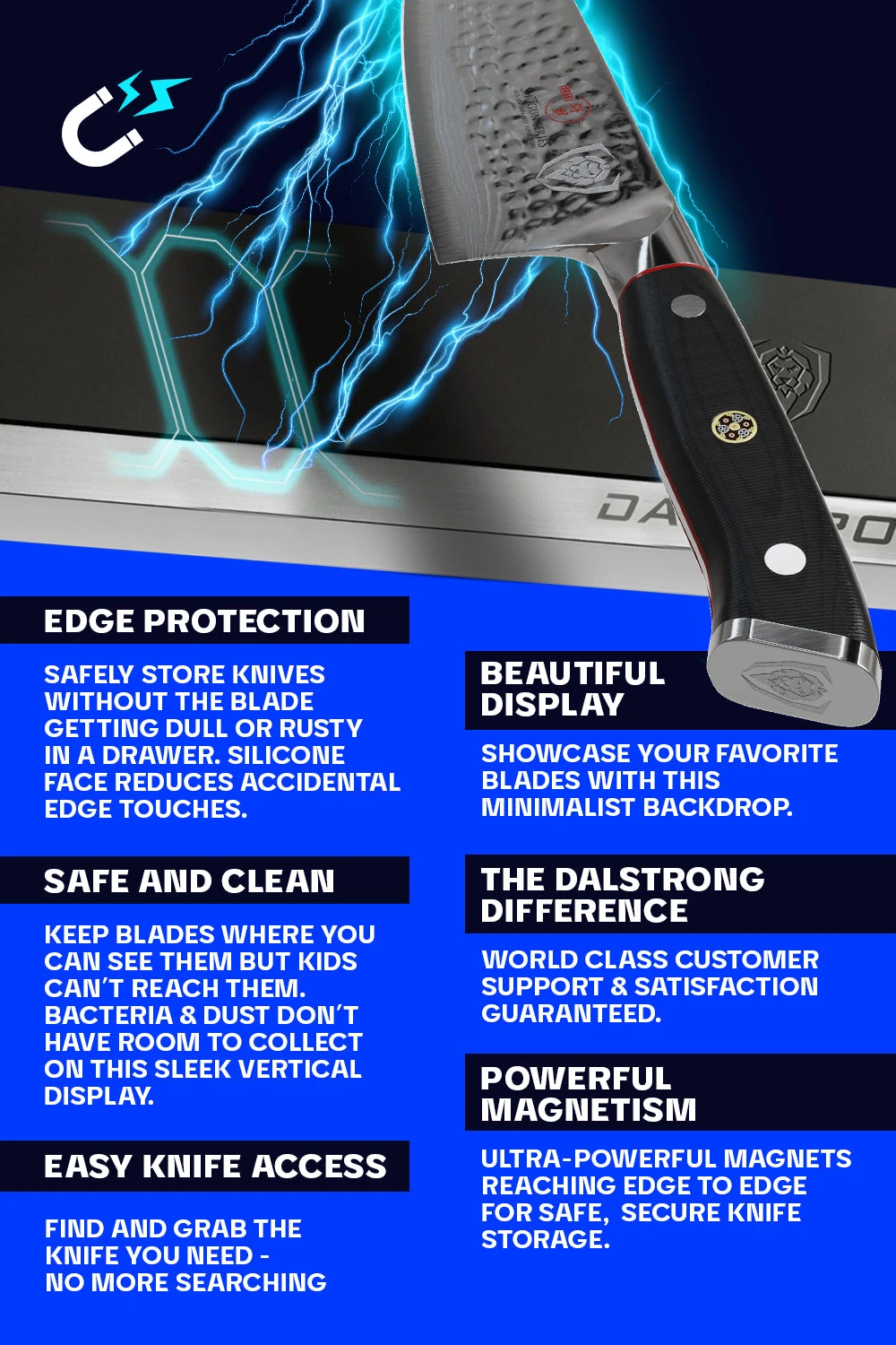 The ultimate in safe, compact, accessible knife storage. The Dalstrong Silicone Magnetic Knife Bar balances powerful magnetic grip with supple, silicone cushioning so your knives cling to the wall without any risk to the blades. Matte black silicone and satin-finished steel give this bar the strength, longevity, and look that make it a perfect storage and display unit.