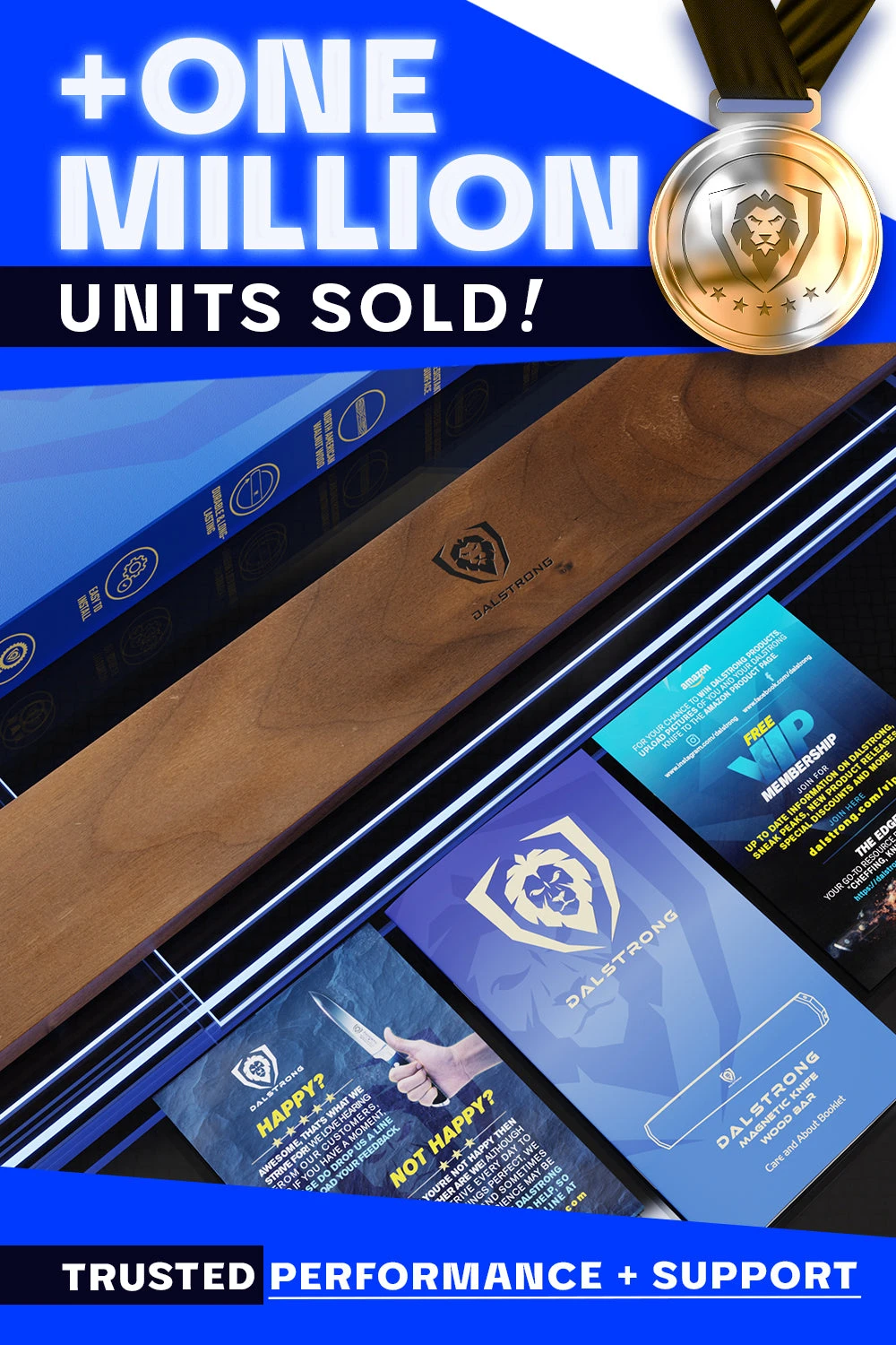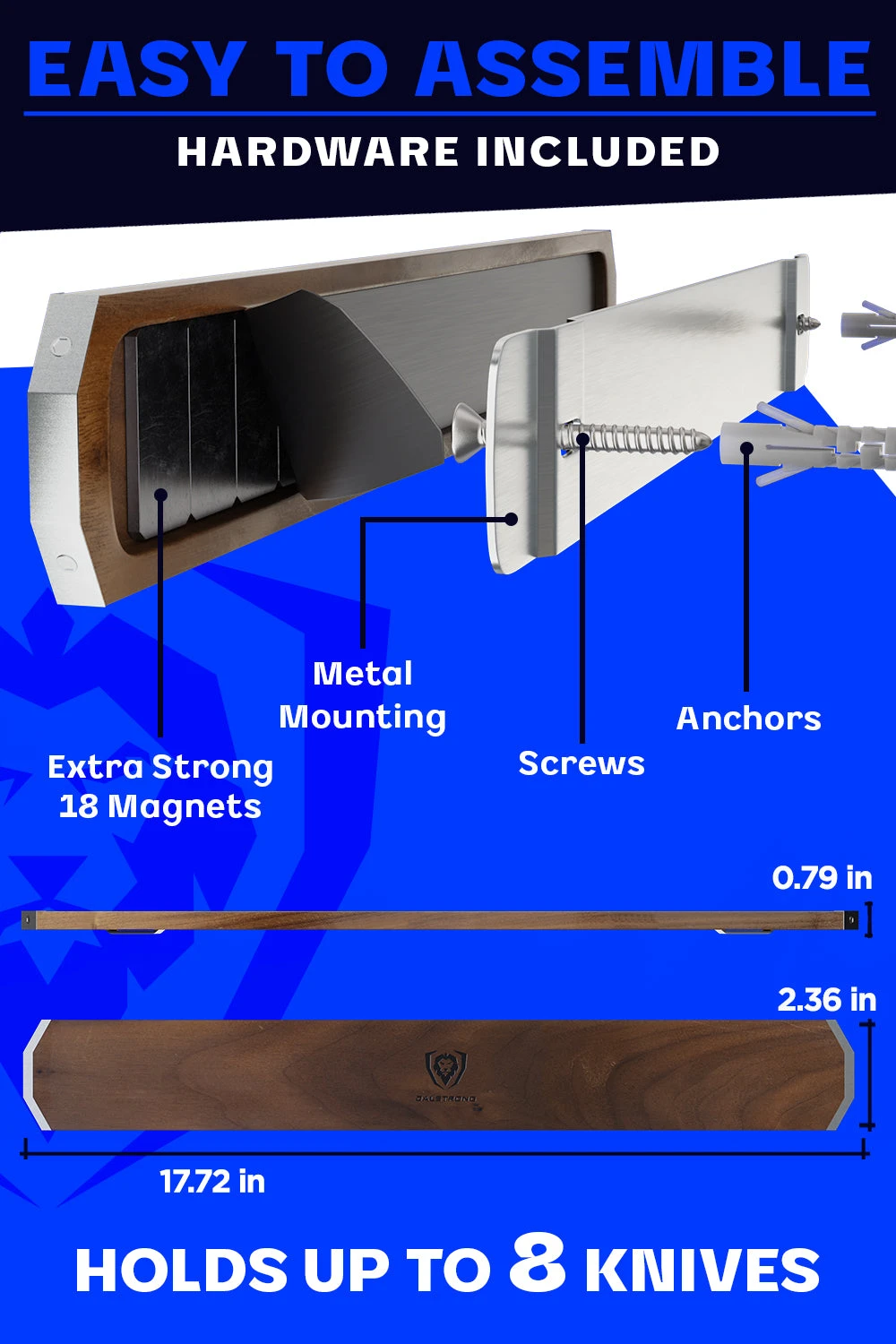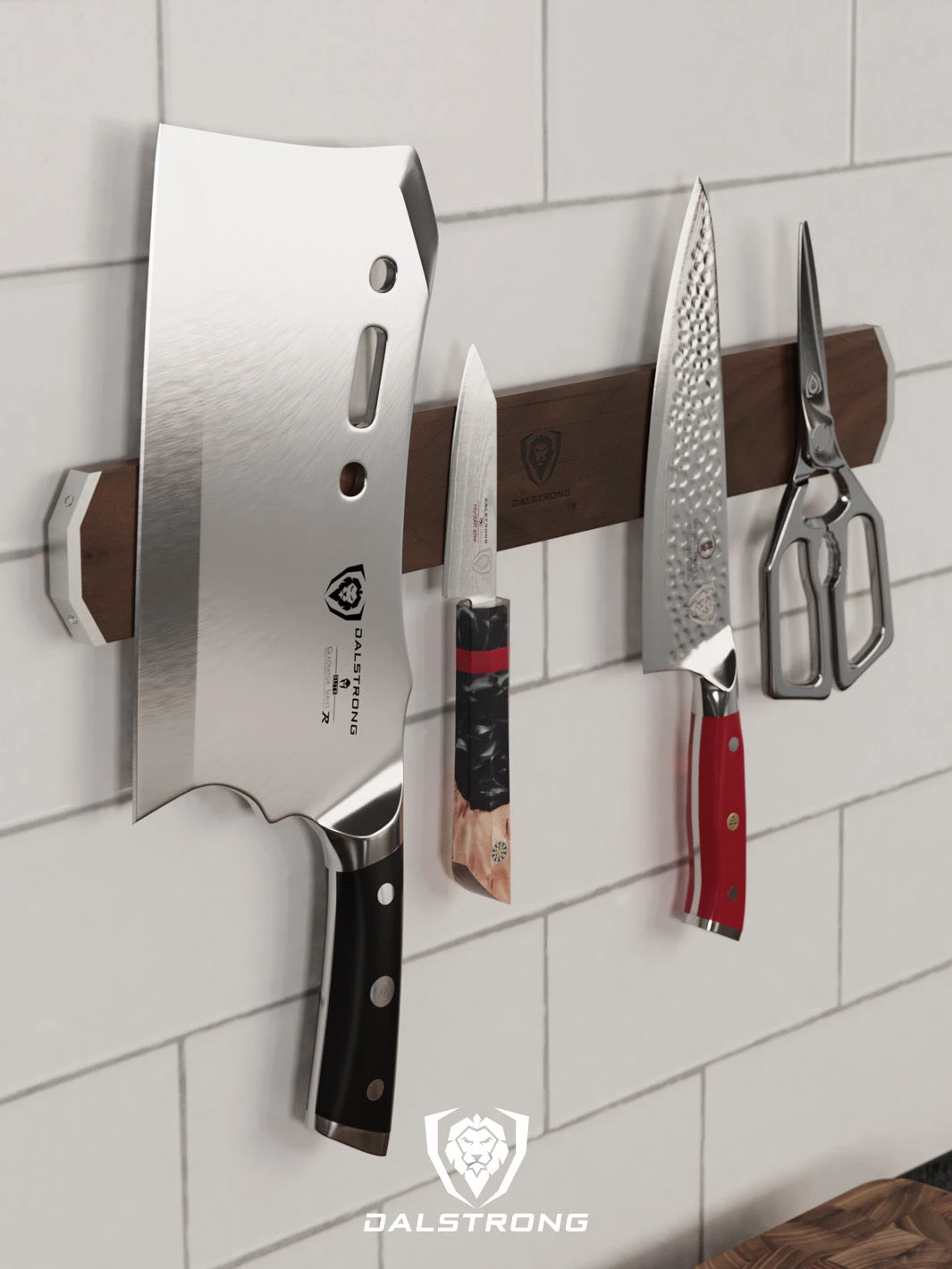 Made from North American Walnut wood hot-stamped with the Dalstrong lionhead, this magnetic bar is not just a stunning and elegant visual addition to your kitchen design: It also serves to protect the blade every time it lands against the grain. The wood surface won’t chip or warp the edge the way a metal surface might. The aluminum alloy provides a light, strong, and durable frame for mounting to the wall.