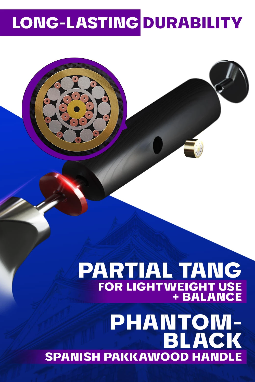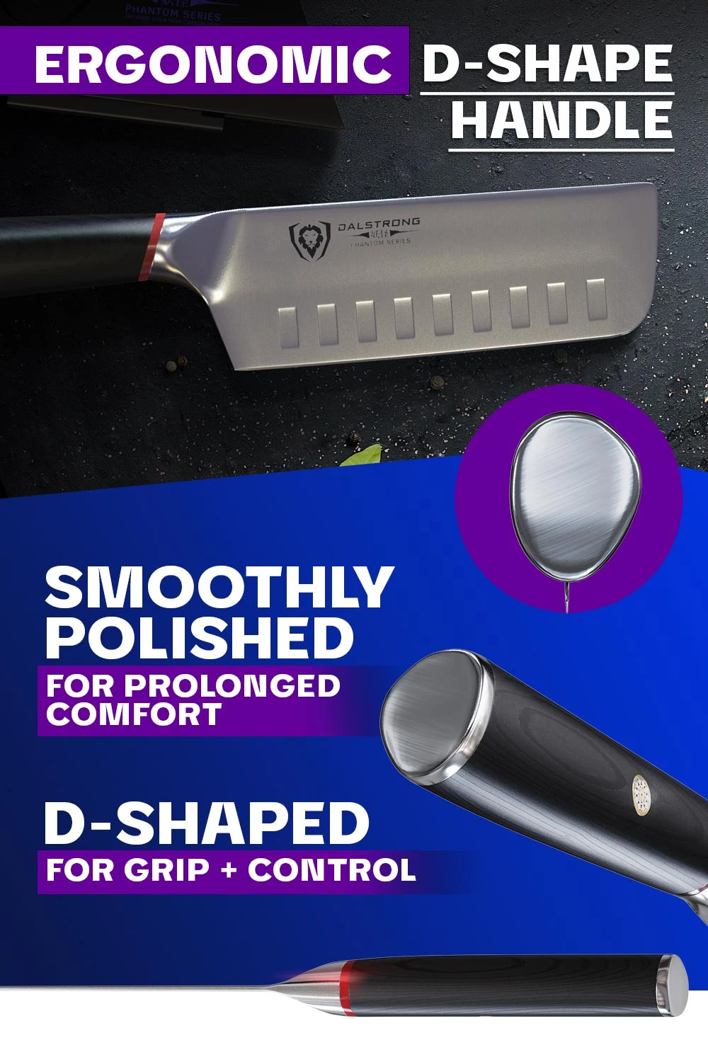 Carefully designed to convey a look of stealthy motion, like a shadow racing through the dark, or a gust of wind blowing through the night, the Phantom Series of knives are elegant, agile and ruthless culinary instruments of exceptional performance. The Nakiri is a favorite among Asian knives for its proficiency, and is essential for any chefs who find themselves prepping vegetables in bulk. Precision forged from a single piece of ice tempered steel, the blade’s straight edge, spine and nose, make it a push-cut specialist, while the wider blades assists in scooping up food for transfer. Improving this blade further are it’s own unique rock-hollow divots, which minimize stuck on food and reduce friction. With a traditional Japanese D-shaped black pakkawood handle designed to tuck perfectly in the palm of your hand. Near the bolster a distinct red spacer and carefully crafted mosaic of copper and brass ensures added elegance and refinement. A hand-polished end cap creates counter balance, ensuring the nimble blade feels more like a ghostly extension of your body, than an ordinary kitchen tool.