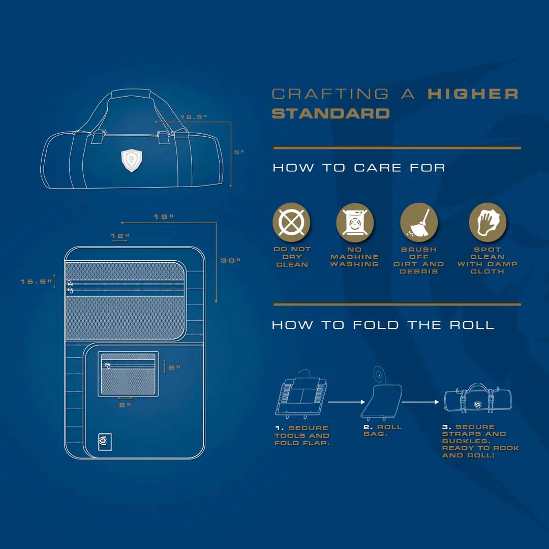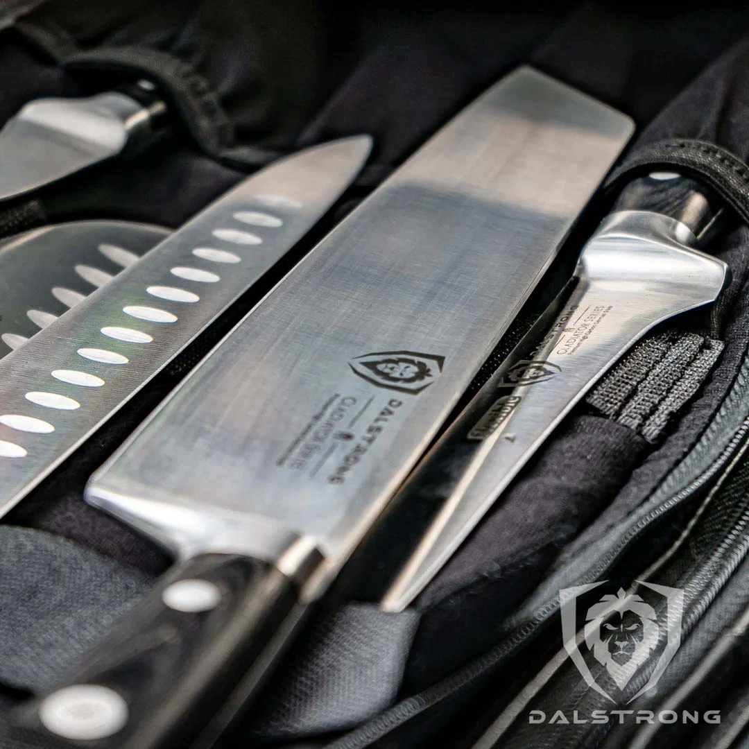 - Equipped with 22 extra strength elastic rimmed knife pockets that wrap perfectly around knife handles. Each pocket is securely fastened with Dalstrong’s exclusive, extra-thick, zipper pull tab and slider for an extremely tight zip that will eliminate excessive knife and tool movement when you are on the go.