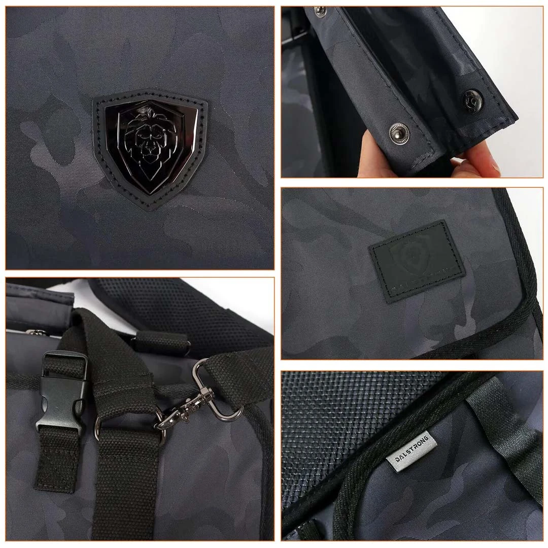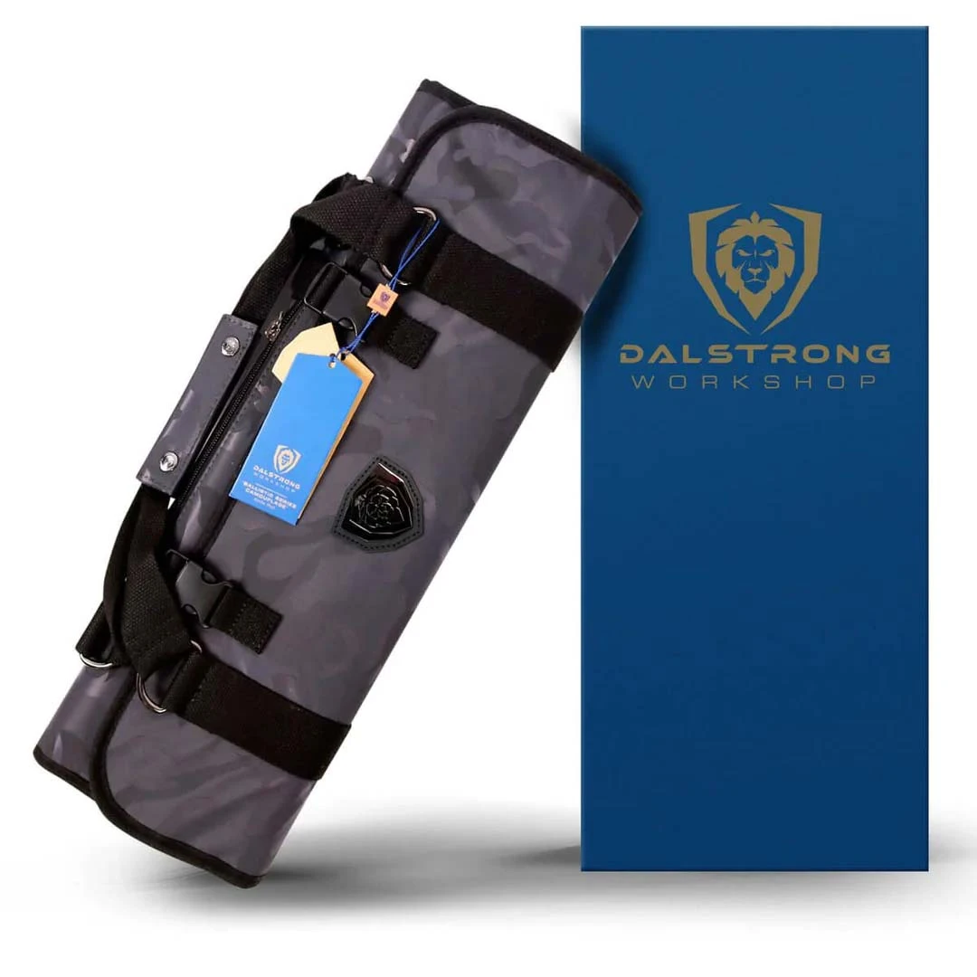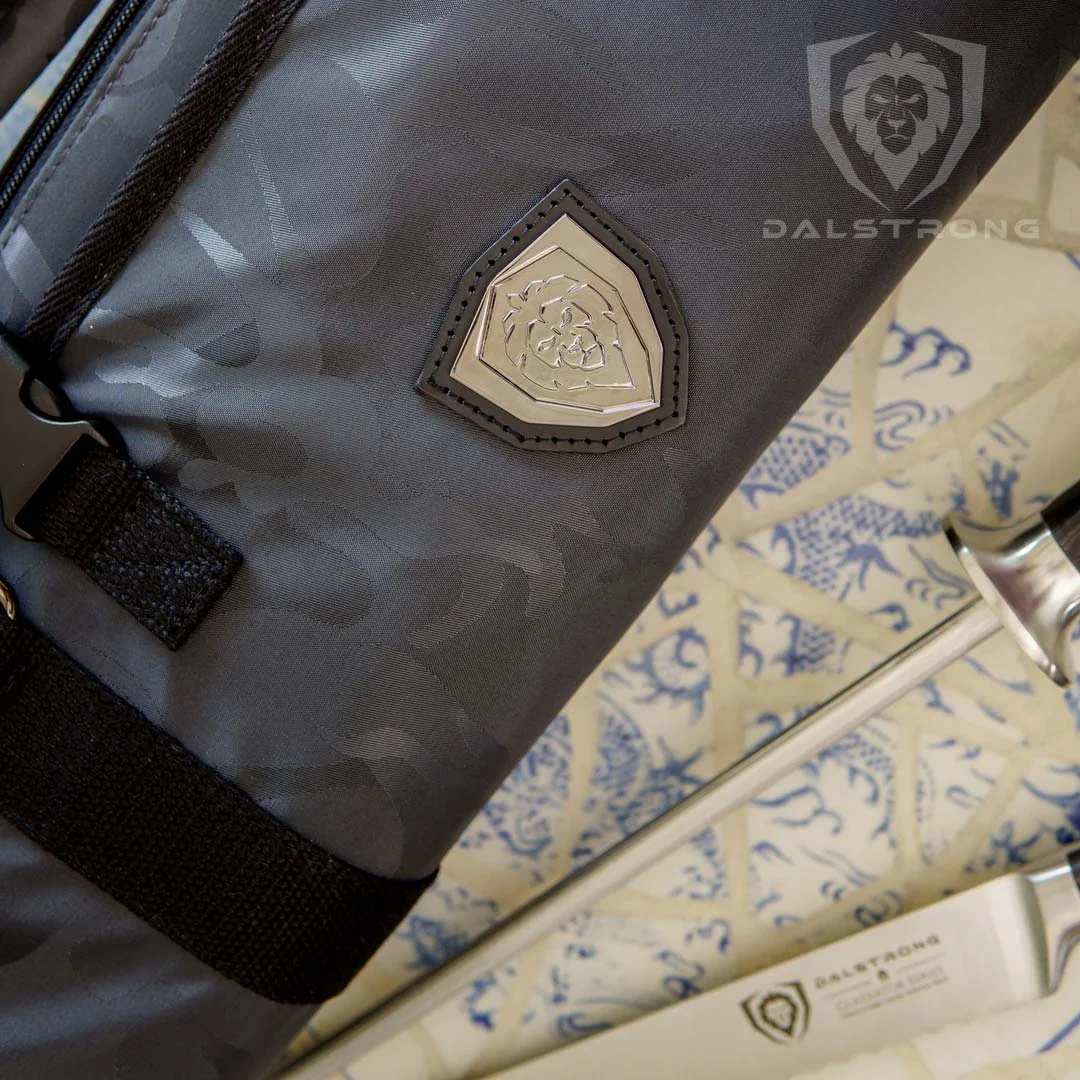 Equipped with 22 interior knife pockets that securely accommodate knives up to 15” in length. Ample storage space with 3 large interior zipper pockets gorgeously lined with extra durable polyester mesh to store smaller items like tasting spoons and disposable gloves, as well as larger items like a microplane, thermometer, and whetstones. Each knife pocket is fitted with an adjustable velcro fastener that gently secures knives for maximum hold and protection. Equipped with 22 extra strength elastic rimmed knife pockets that wrap perfectly around knife handles. Each pocket is securely fastened with Dalstrong’s exclusive, extra-thick, zipper pull tab and slider for an extremely tight zip that will eliminate excessive knife and tool movement when you are on the go. An interior built to last with durable 100% nylon fabric that is lightweight, fast-drying, and resistant to various oils and chemicals. 100% premium leather accents. Equipped with Dalstrong’s exclusive, extra-large, zipper pull tab and slider. Ballistic nylon exterior for exceptional tear resistance and maximum durability while still being soft and non-abrasive to the kitchen tools inside. One (1) detachable shoulder strap, with extra-large black vegan leather shoulder strap pads, is included that attach to heavy duty, rust-proof iron D-Rings. A premium leather handle strap engraved with the iconic Dalstrong logo and secured with two distinct copper metal Dalstrong snaps provide a sturdy cushioned grip so that you can carry your valued tools longer. Alternating knife pockets ensure perfect weight distribution.