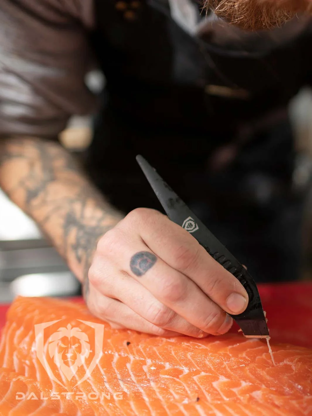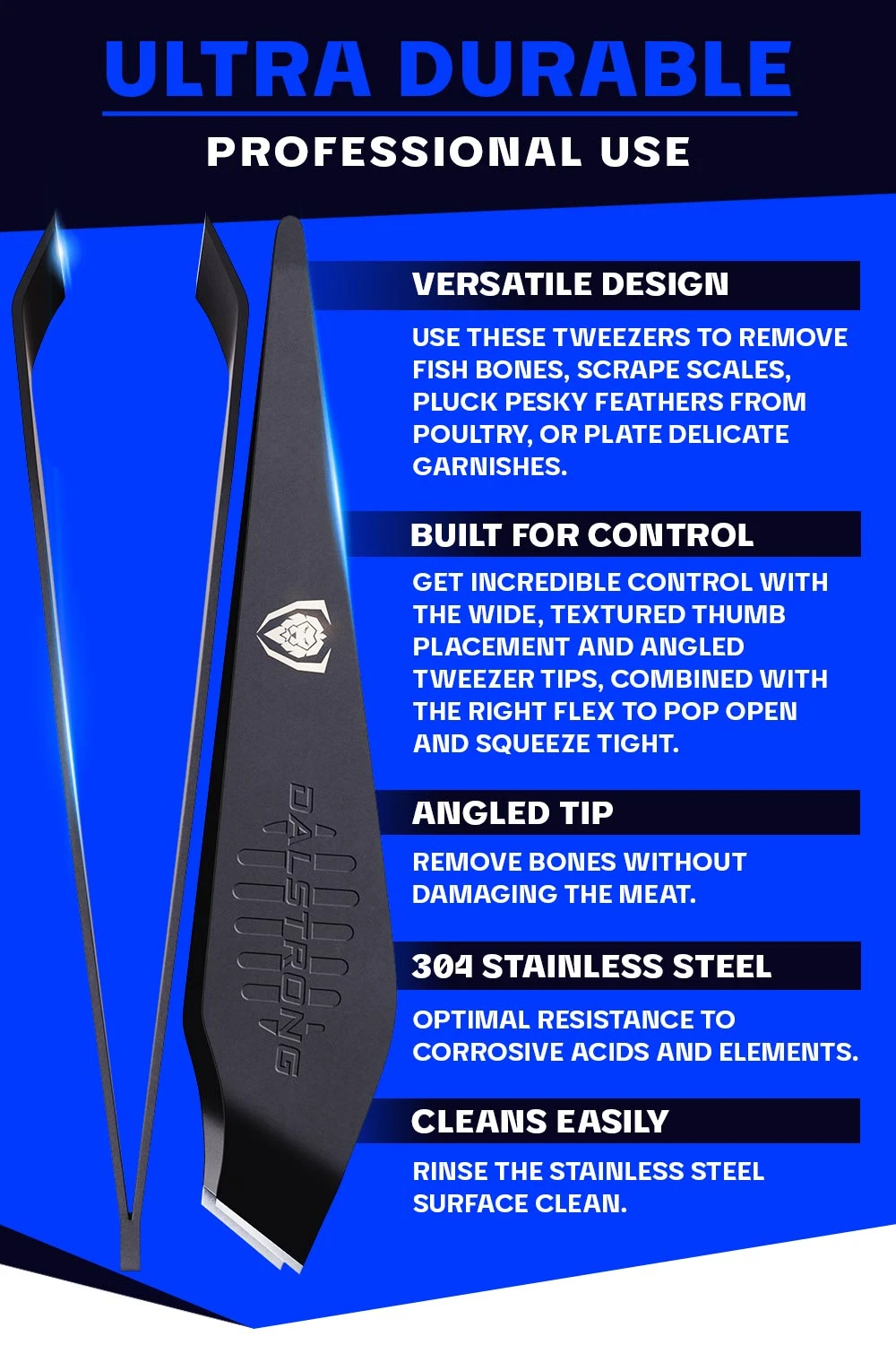 At Dalstrong we don’t stop at high-performing knives — we want to upgrade every accessory in your kitchen. The Dalstrong Fish Tweezers are made for chefs, anglers, and seafood connoisseurs alike, for effortless deboning with more finesse than a filet knife. Quickly and easily remove bones and scales by simply squeezing and pulling. The angled tip allows you to pull out bones without damaging the meat in the process, while the textured grip allows you to keep a firm grip as you work, even in slippery conditions.