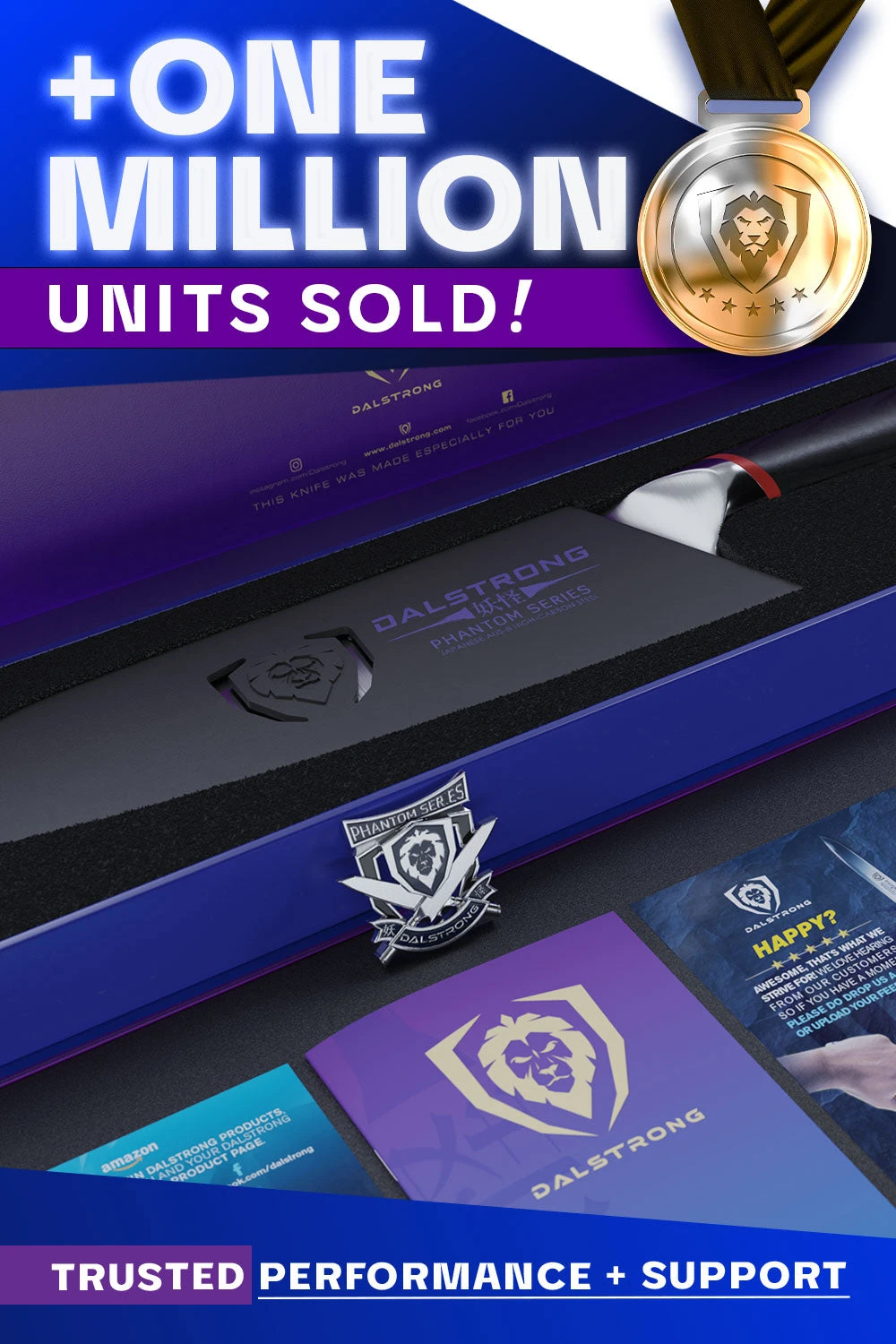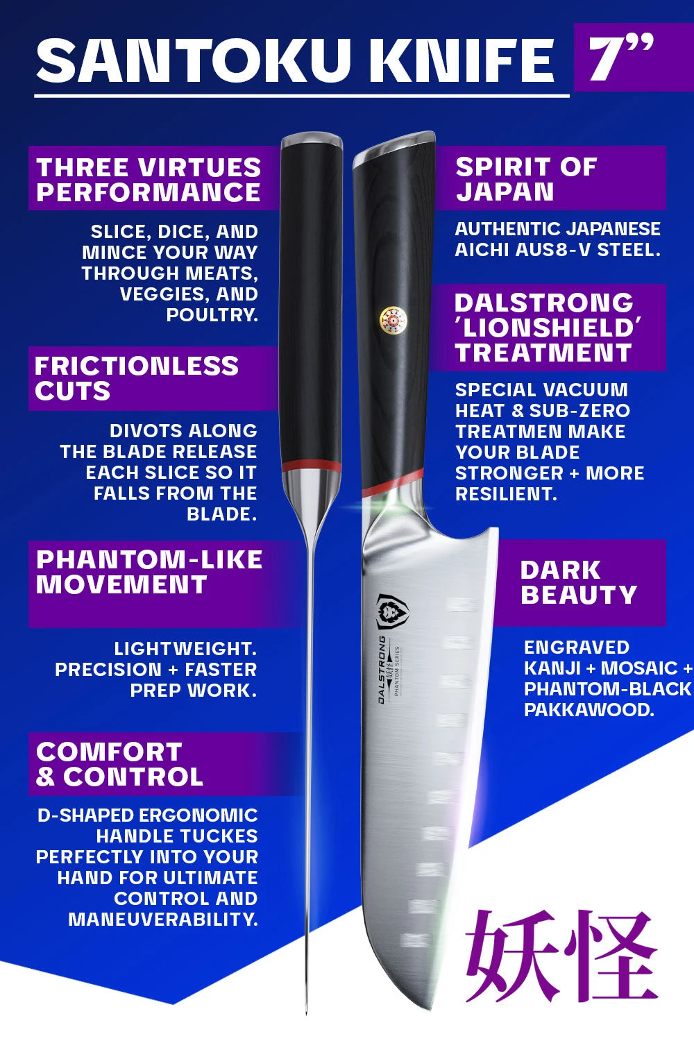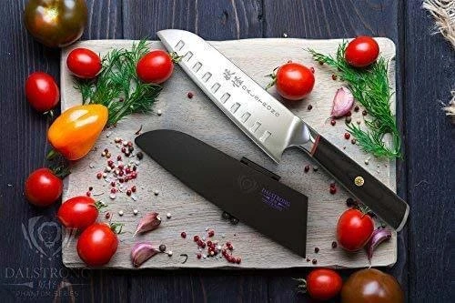 The Phantom Series 7” santoku further adds rock hollow divots which minimize stuck on food and create air pockets to reduce friction. Excelling at slicing, dicing and mincing (the ‘three virtues’ of the knife. ‘Santoku’ in Japanese means “three virtues’ of ‘three uses’), the Phantom Series santoku is a must for every chef’s cutlery roll. Featuring Japanese AUS-8 steel beautifully engraved with the Dalstrong name down the spine as well as the Japanese kanji for ‘phantom’ or ‘ghost’.