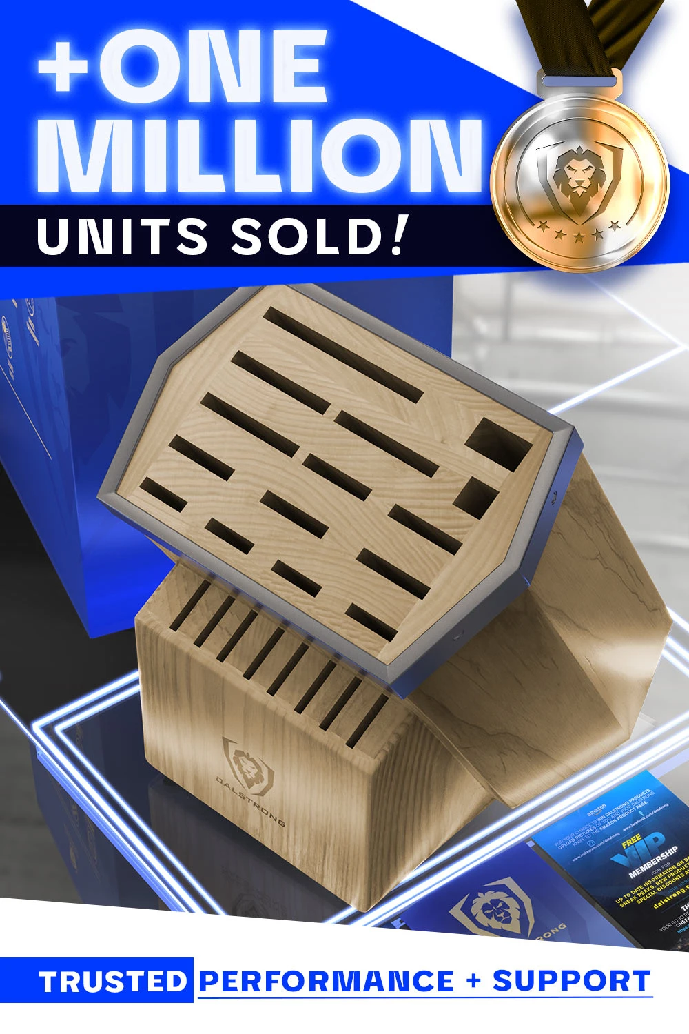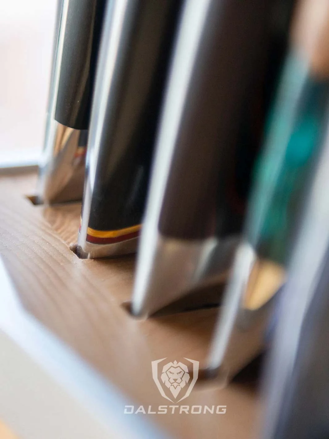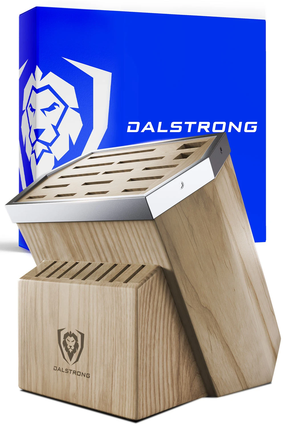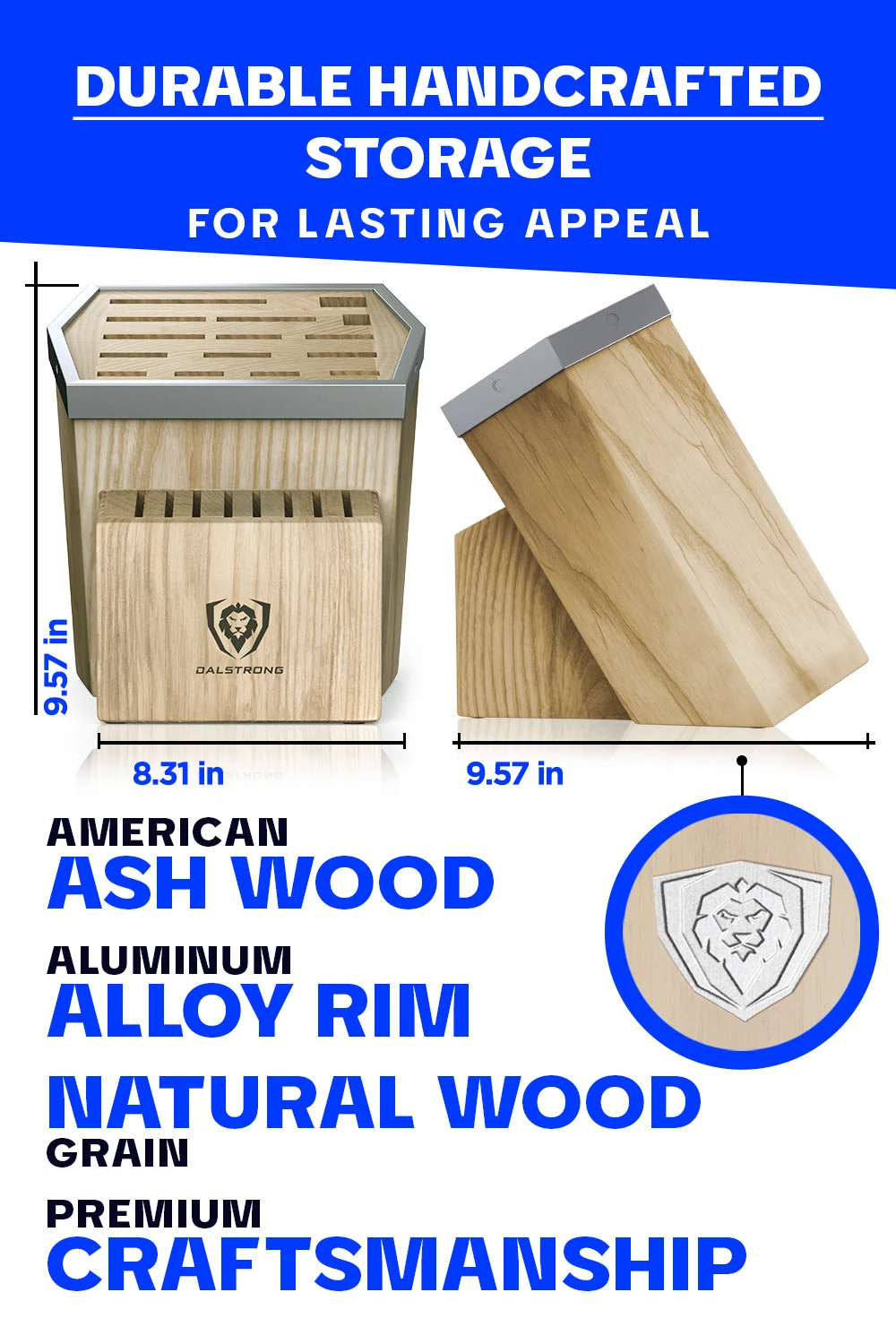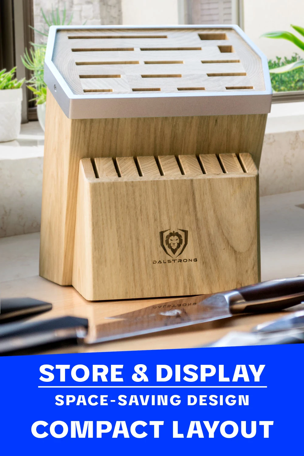 Home – fortress – sanctum sanctorum – whatever you call it, everyone needs somewhere safe to rest and recoup for the next big adventure. For your knives, that safe space comes in the form of a Dalstrong knife roll, magnetic stand, or block. A good knife block protects your knives from damage, ensures they are always within reach and can be artfully displayed. The Dalstrong 23 Slot Universal Knife Block is that perfect blend of form and function. Meticulously crafted from ash wood grown in the United States of America and chosen for its combination of strength, flexibility, and bright, beautiful wood grain, this block is sure to inspire awe.